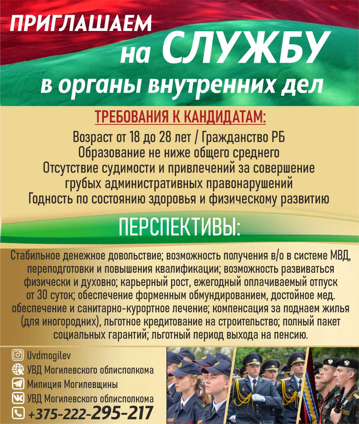 Чтобы стать офицером, лучше всего поступить в Академию МВД, Могилевский институт МВД и Белорусский государственный университет информатики и радиоэлектроники. Для этого необходимо обратиться до 15 апреля 2026 года в группу кадров территориального органа внутренних дел с заявлением на имя начальника РОВД.